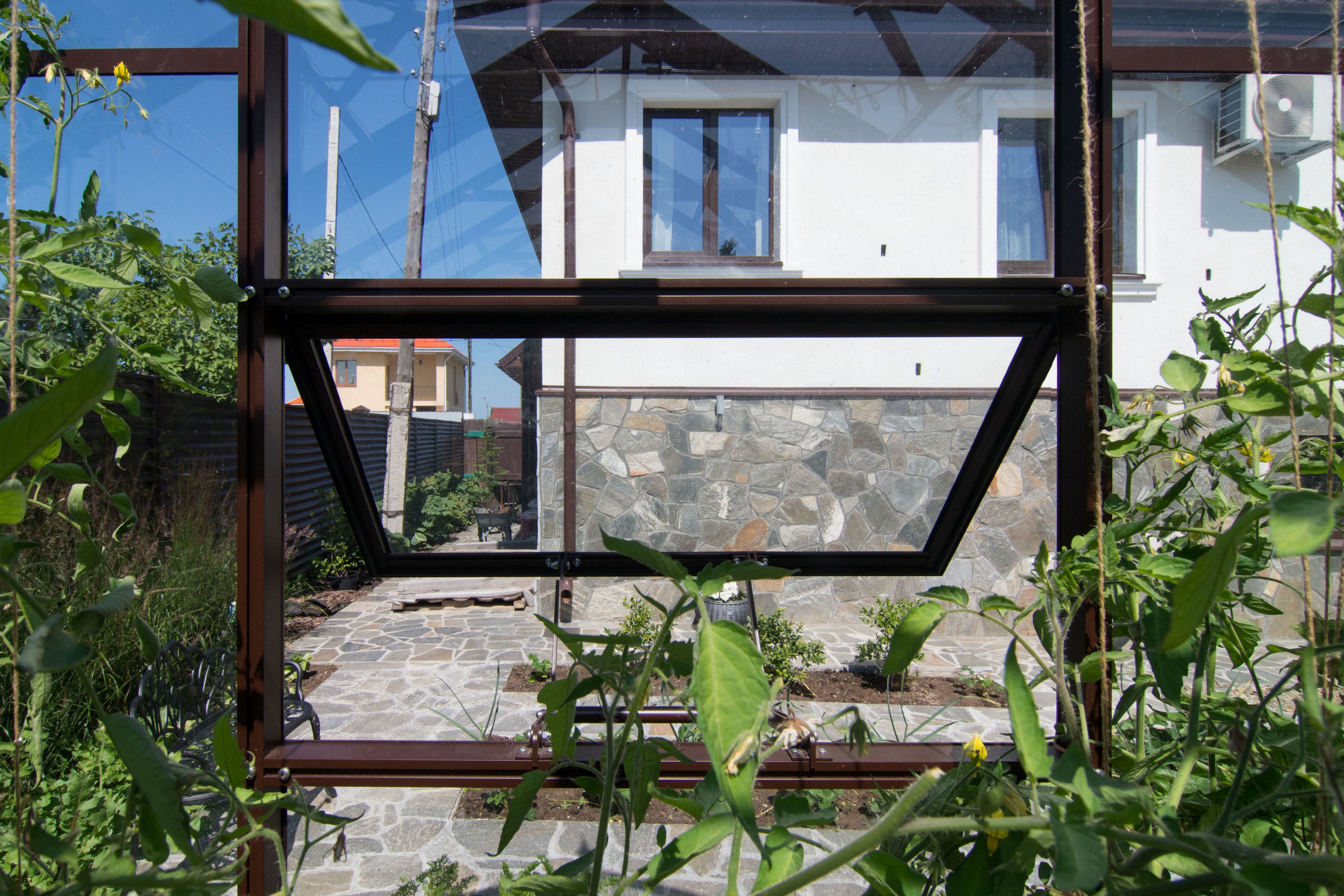 В качестве покрытия используется стекло — материал с высокой светопропускной способностью, обеспечивающий естественное освещение растений. Стеклянные панели создают оптимальные условия для фотосинтеза и поддержания стабильного микроклимата внутри теплицы.